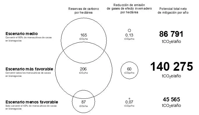 Los resultados para el área piloto de la Provincia del Datem del Marañón muestran que el potencial neto de mitigación al cambiar un monocultivo de cacao al sistema de bionegocios es el más alto registrado un valor de 4’208.263,08 tCO2. En el escenario donde el 80% es un monocutlivo y el otro 20% se encuentran los bionegocios (escenario actual), el cambio por la actividad RPF muestra un potencial de mitigación neto es de 2’603.739,94 tCO2/ha. Finalmente, el escenario donde el 42% de corresponde a monocultivos y el 58% a bionegocios (escenarios de expansión en todos los corredores), el potencial de mitigación neto de cambiar todo con la actividad es de 1’366.963,47 tCO2/ha.