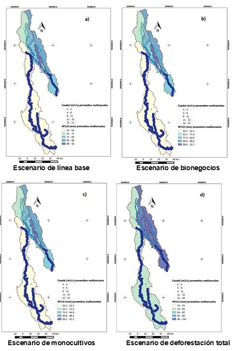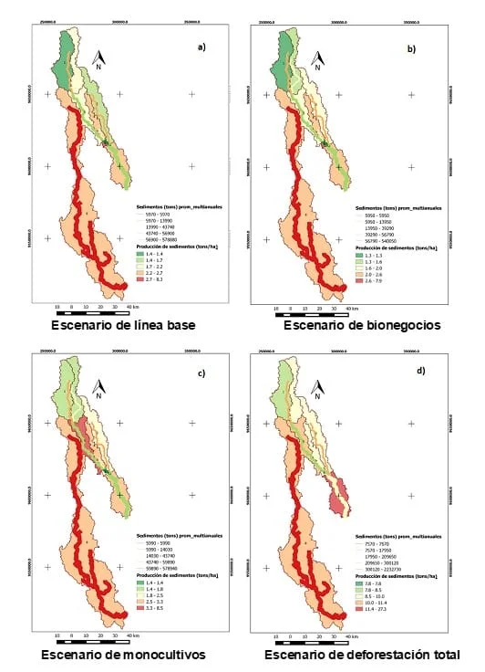 En la Figura 4, no se observan cambios significativos en la producción de sedimentos entre los escenarios, debido a las áreas pequeñas que son intervenidas (1–3%). El escenario de bionegocios es capaz de reducir la erosión del suelo y por tanto el transporte de sedimentos en los ríos para evitar la afectación de la calidad física del agua. El escenario de deforestación total muestra que los bosques y los bionegocios ayudan a reducir la erosión del suelo y el transporte de sedimentos. Si estos son deforestados, se espera que la carga de sedimentos se multiplique por un factor de entre 3 y 6 veces el valor actual, afectando considerablemente la calidad física del agua.