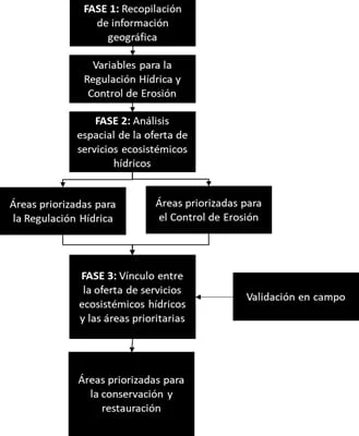 Para la priorización de las áreas de conservación y restauración se contemplan tres fases metodológicas (Figura 1): (1) La primera fase comprende la recopilación y sistematización de la información geográfica, la misma que se trabaja en base a la información generada del área de estudio, así como información secundaria a nivel nacional que se disponga para esta zona. (2) La segunda fase comprende el análisis espacial para las áreas prioritarias para conservación y restauración. (3) Finalmente, la tercera fase analiza las áreas prioritarias para conservación y restauración en función de la regulación hídrica y el control de la erosión, con el objetivo de identificar áreas de trabajo e intervenciones que pueden ser aplicadas en los territorios priorizados.
