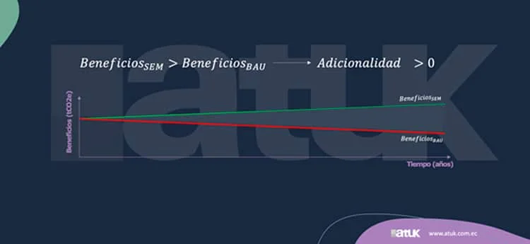 La cuantificación de la adicionalidad de un proyecto depende de, al menos, tres escenarios. El primero es un escenario actual BASE, un estado del lugar de intervención antes del proyecto. El segundo es un escenario de línea base Business as Usual, BAU -por sus siglas en inglés-, que consiste en una estimación de cómo reaccionaría el escenario BASE en ausencia de intervención del proyecto de carbono. El tercero es un escenario del proyecto Sustainable Ecosystem Management, SEM -por sus siglas en inglés-, que engloba como se desarrollaría el escenario BASE con la intervención del proyecto de carbono. La relación causa y efecto se determina entre los escenarios BAU (Business as Usual) y SEM (Sustainable Ecosystem Management).