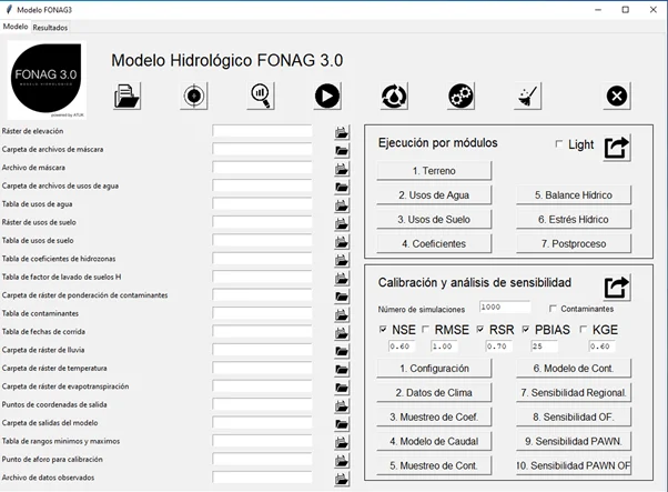 El modelo hidrológico FONAG 3.0 by ATUK es un modelo de simulación continuo, conceptual, y determinístico, que procesa y genera datos a escala temporal mensual y a escala espacial distribuida. El modelo FONAG 3.0 by ATUK cuenta con un módulo de calibración automática, el cual funciona de manera agregada en el punto de aforo.