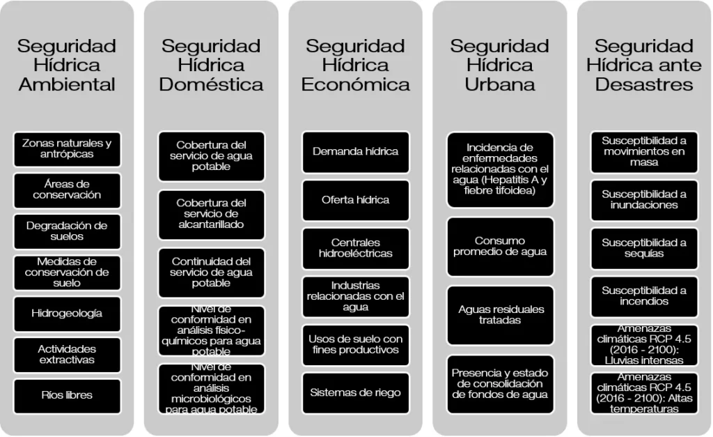 La seguridad hídrica ambiental promedio en el país alcanza 3.48 puntos categorizándose como moderada. Esto es resultado principalmente de la pérdida de ecosistemas naturales terrestres y acuáticos y la extensión de actividades antrópicas, concesiones para actividades extractivas y degradación del suelo. Existen algunas iniciativas de conservación ambiental, así como de implementación de medidas de conservación del agua y suelo que compensan los efectos negativos. La seguridad hídrica doméstica alcanza un promedio de 3.32 puntos categorizándose como moderada. La seguridad hídrica doméstica se ve afectada por la cobertura del servicio de agua potable en zonas más remotas, una cobertura deficiente del servicio de alcantarillado en general, la continuidad de los servicios de agua potable y saneamiento, así como fallas eventuales en análisis de calidad fisicoquímicos y microbiológicos del agua para consumo humano. La seguridad hídrica económica promedio en el país se califica con 2.36 puntos, el puntaje más más bajo de las cinco dimensiones analizadas, correspondiente a una categoría de baja seguridad hídrica. Este es el resultado de un alto estrés hídrico (demanda de agua por encima de la oferta hídrica) y la presión de diferentes actividades económico-productivas que dependen del agua como generación hidroeléctrica, industria, riego y tierras con aptitud productiva. La seguridad hídrica urbana promedio en el país se califica con 2.79 puntos, también en una categoría baja. Esto es el resultado de la presencia de enfermedades relacionadas con el agua como la Hepatitis A y la fiebre tifoidea, el alto consumo promedio de agua por habitante en general en el territorio nacional, el poco tratamiento de las aguas residuales, y que la mayor parte del territorio nacional no cuenta con mecanismos de protección de fuentes de agua, tales como fondos de agua. Finalmente, la seguridad hídrica ante desastres promedio se califica con 3.26 puntos, resultando en una categoría moderada. La resiliencia ante desastres se ve comprometida debido a la susceptibilidad a varios eventos extremos o desastres naturales potenciales como movimientos de masa, inundaciones, sequías, incendios, así como a potenciales efectos del cambio climático manifestados a través de altas temperaturas y lluvias intensas.