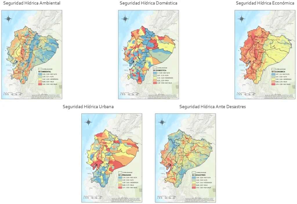 Es claro el contraste entre las zonas de baja y muy baja seguridad hídrica (cordillera occidental y zona costera del Ecuador) y aquellas zonas de alta y muy alta seguridad hídrica (cordillera oriental y zona amazónica del Ecuador).